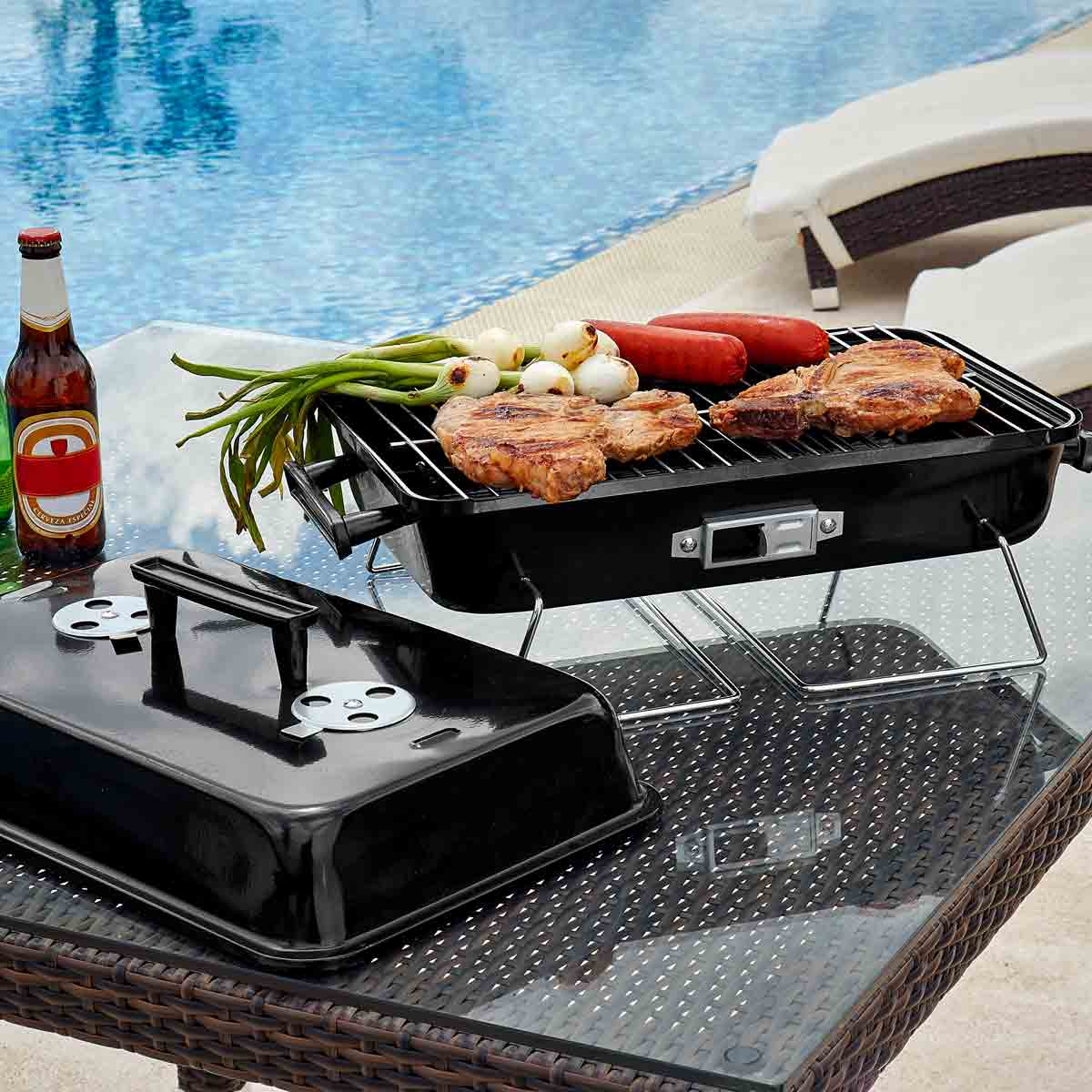 Asador portátil de carbón. Incluye parrilla y tapa con difusor de temperatura. Base con asas.