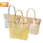 Bolsa con asas de algodón, fuelle y compartimento principal con elástico y botón de madera para abrir o cerrar.