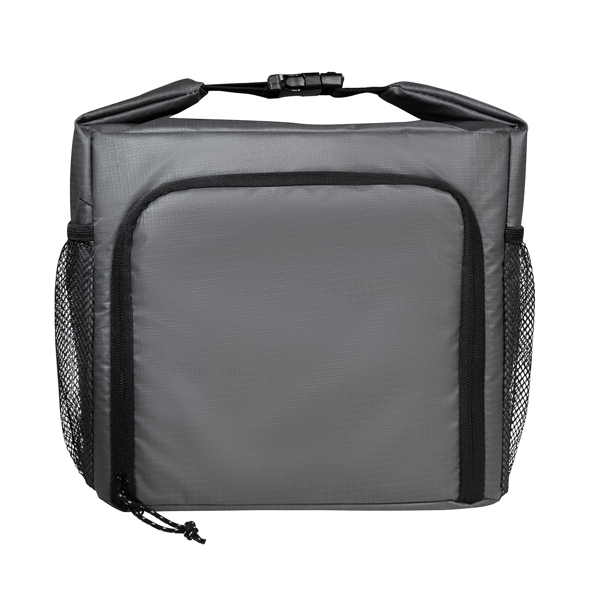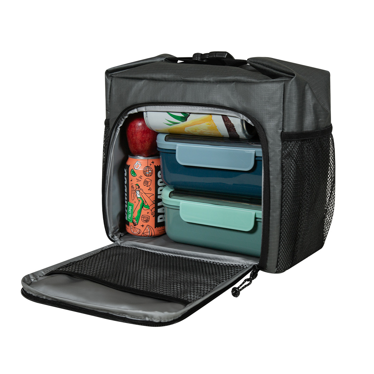 Lonchera con interior plastificado. Cuenta con bolsillo principal frontal con cierre para almacenar alimentos de forma segura. En ambos laterales, cuenta con un bolsillo de malla, ideal para botellas de agua u otros artículos de acceso rápido. En la parte superior, integra un asa con broche de plástico que facilita su portabilidad.