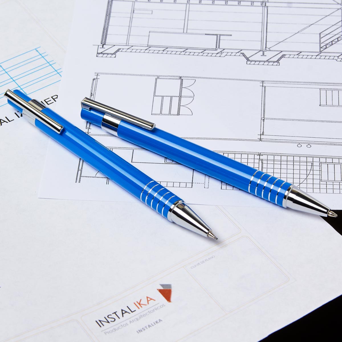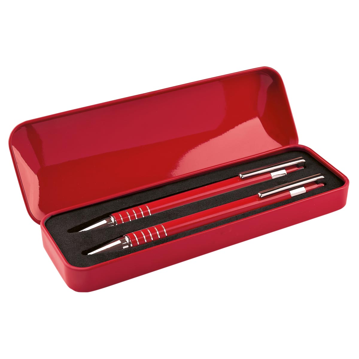 Bolígrafo y lapicera 0.5 mm. Mecanismo pulsador. Incluye estuche metálico.